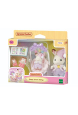 Deze schattige Sylvanian Families set bevat Freya en Flora in bijpassende exclusieve pyjama's en slaapmutsen, elk knuffelend met hun eigen konijnenspeeltjes.